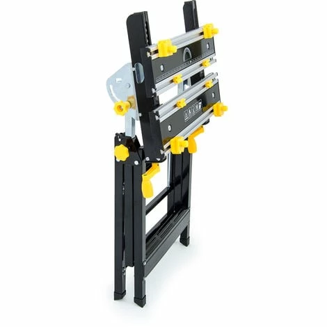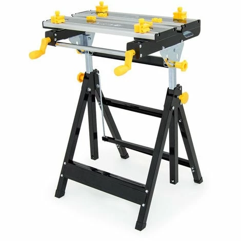 The ultimate in portable workbench design and performance. This workbench features strong steel aluminium work tops with vice clamping function. The table may be tilted to any one of 3 positions allowing cutting and working angles to be set to suit the job in hand. The height of the worktable may be adjusted to one of 6 setting points with the aid of a foot controlled locking lever. Supplied with 8 clamping blocks which slide to the required position in the jaw edges and work top grooves. Folds for easy transport and storage.